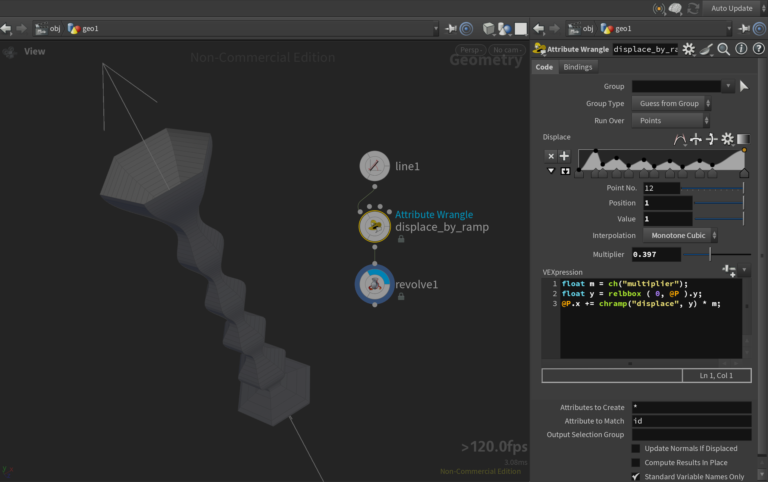Hi, There are many ways to do this. Here is one way: float m = ch("multiplier"); float y = relbbox ( 0, @P ).y; @P.x += chramp("displace", y) * m; - Yesterday
