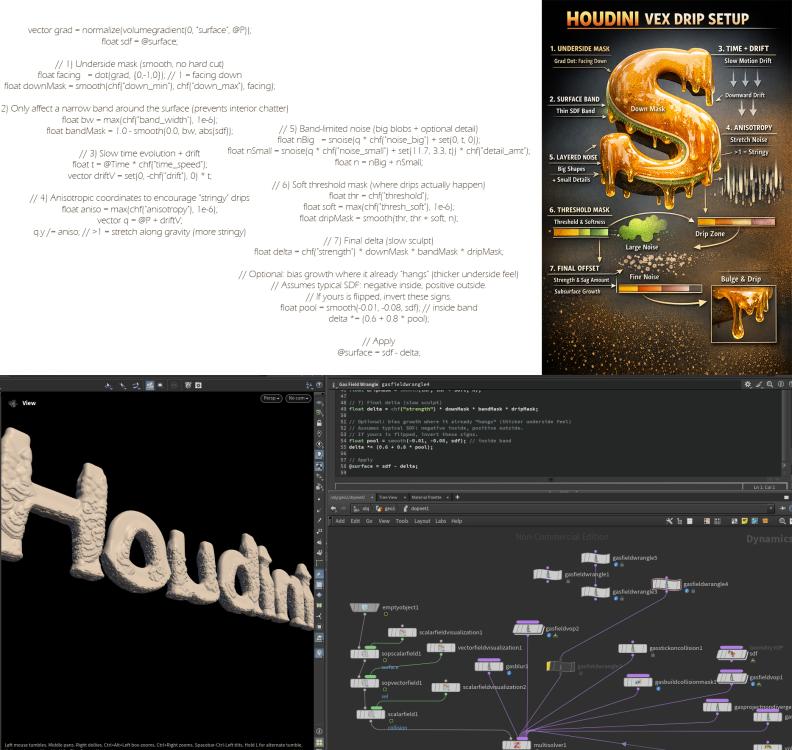 Hi magicians, How can I create something like this? (ref attached). Idea is to be somehow realistic, but also art directable, I'm struggling to have some nice dripping, mostly vertical, falling within a FLIP sim. So far I've played with surface tension, stick colision, viscosity, different emitters, and some custom forces, but still looks pretty messy. Any thoughts? Thanks!