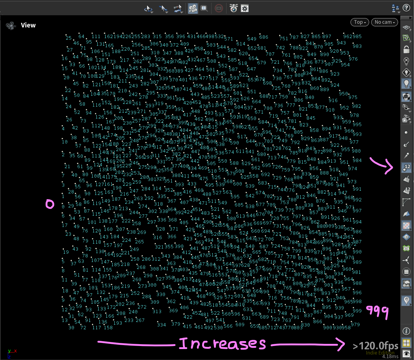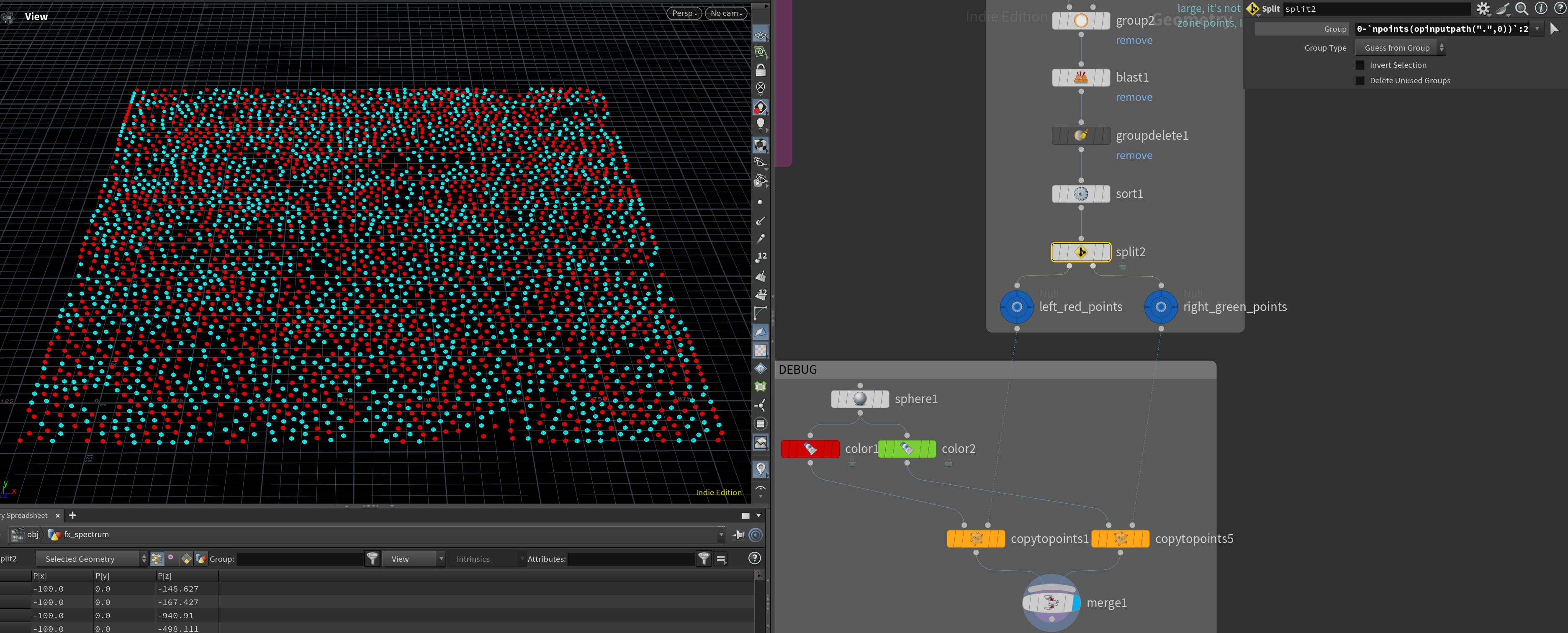 I've got these points that don't seem to want to listen: I wanted to sort them in the x axis, so the 0 is to the left and the highest point number is on the right of the x axis, and the same applies to the first half of points and 2nd half of points. I have placed some colored spheres to visualise and realised my lovely points don't seem care about the sort node (Sort, point By X, couldn't be clearler), or am I doing something wrong that confused them? I would have expected the left side is all red and the right side is all green. sortingbyX.hiplc