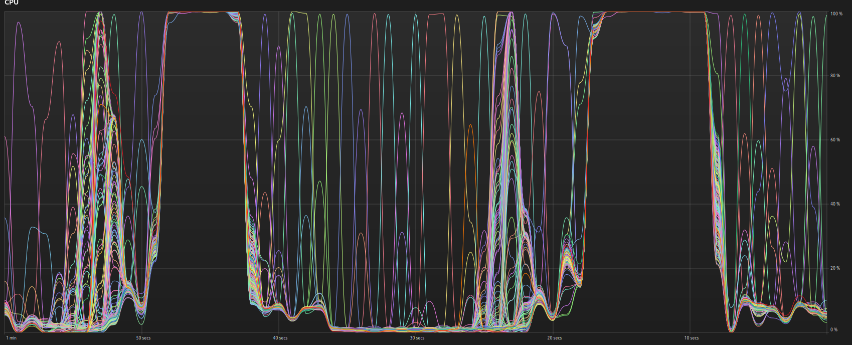 Is the Karma dicing / render time displacement of the ocean single threaded? If you look at the CPU chart (showing 2 frames), the actual rendering happens in the 2 gaps where all threads are at 100% The spectrum bgeo is 36mb! and the mask 240 frame sequence is 230mb There are three visible stages (% time per frame): 1. 50% of the time -> One thread at a time 2. 10-20% of the time -> Right before the they all reach 100% there is some dance there, not sure what that is 3. 30% of the time -> all threads at 100% Do you have any idea of what is being done in each of these stages? the last being render because one done the image appears in the render directory.