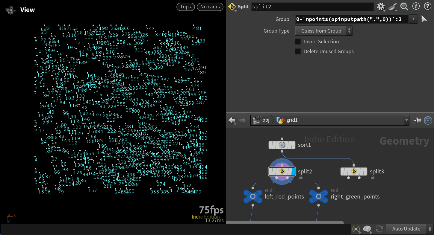 Hi ! You can use the .12 icon to the right of the viewport to see your point numbers. As you can see, your points are properly increasing. In other words - your sort node works as you intend. You can bypass your sort node to see what the point numbers would be otherwise. The issue is with the logic in your split2 node. 0-`npoints(opinputpath(".",0))`:2 You're saying to keep all points from 0 to 999, but take one point out of two. This does give half the amount of points, but it takes 0, 2, 4, 6, 8, ..., 990, 992, 994, 996, 998 If you look at where 990, 992... are in the above screenshot, they're on "the wrong side". Instead, you want to take the points from 0 to 499, like so 0-`npoints(opinputpath(".",0))*0.5` You can simplify this like so 0-`npoints(0)*0.5` Then coloring your points will give the expected result. sortingbyX_fixed.hiplc -