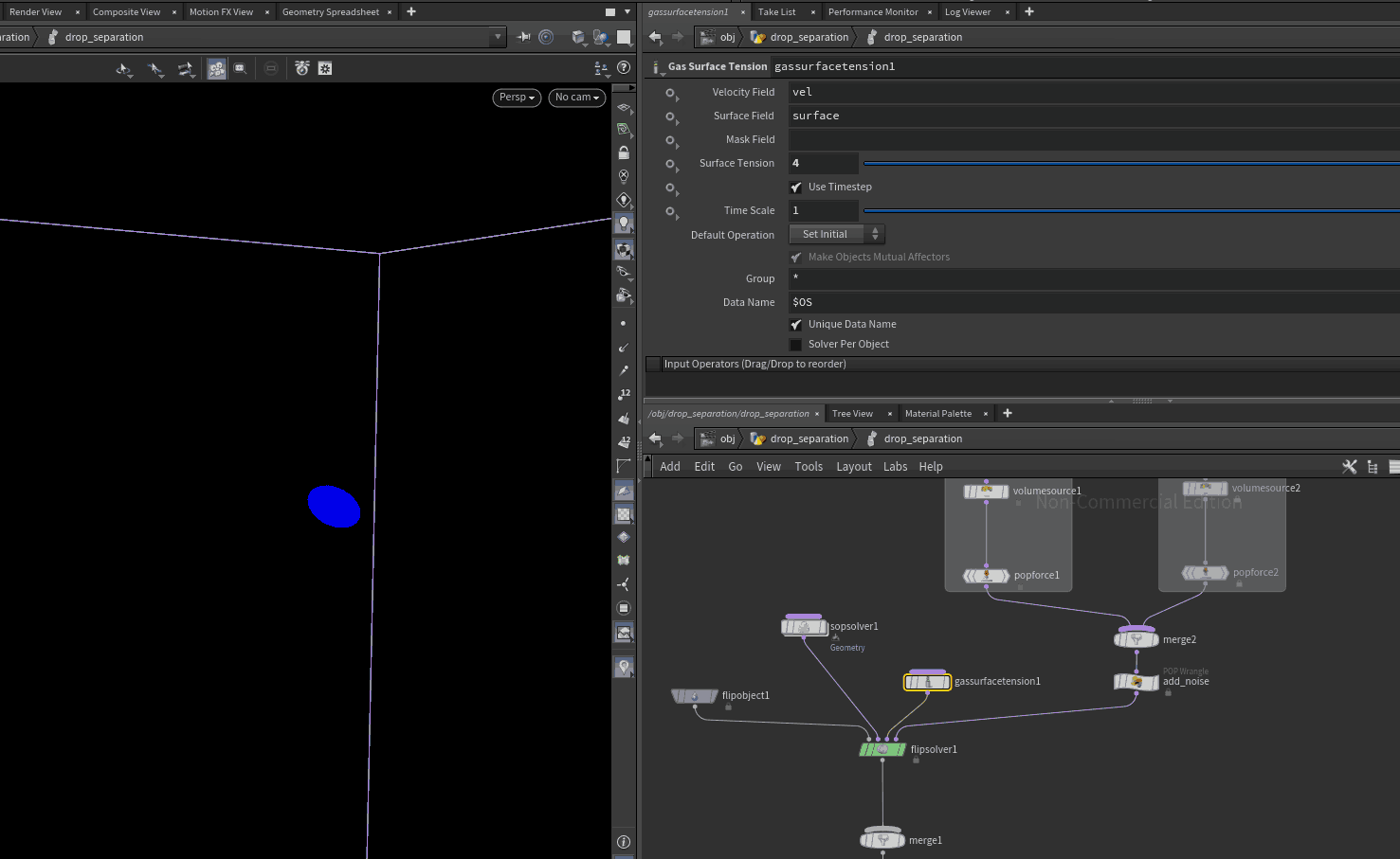 Hi everyone, I'm trying to create a FLIP simulation where a fluid source is split into two parts: a blue top and a red bottom. My goal is to have them physically separate, with the red part falling away from the blue part. However, the fluid stays connected and won't split. Blue source: force attribute set to (0, 0.1, 0) Red source: force attribute set to (0, -9.8, 0) Even with these opposing forces, the drops remain stuck together. How can I achieve physical separation between these two colored regions within the same FLIP solver? I tried various values for surface tension and viscosity. I've attached my HIP file for reference. Thank you! drop_separation.hiplc